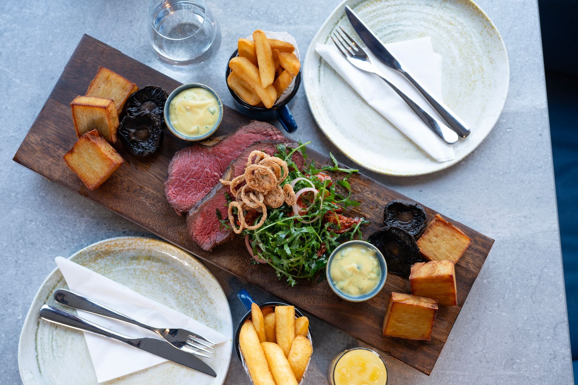 New York strip for 2 – beef dripping Pomme Anne – crispy shallots – confit tomatoes – peppery leaves - béarnaise